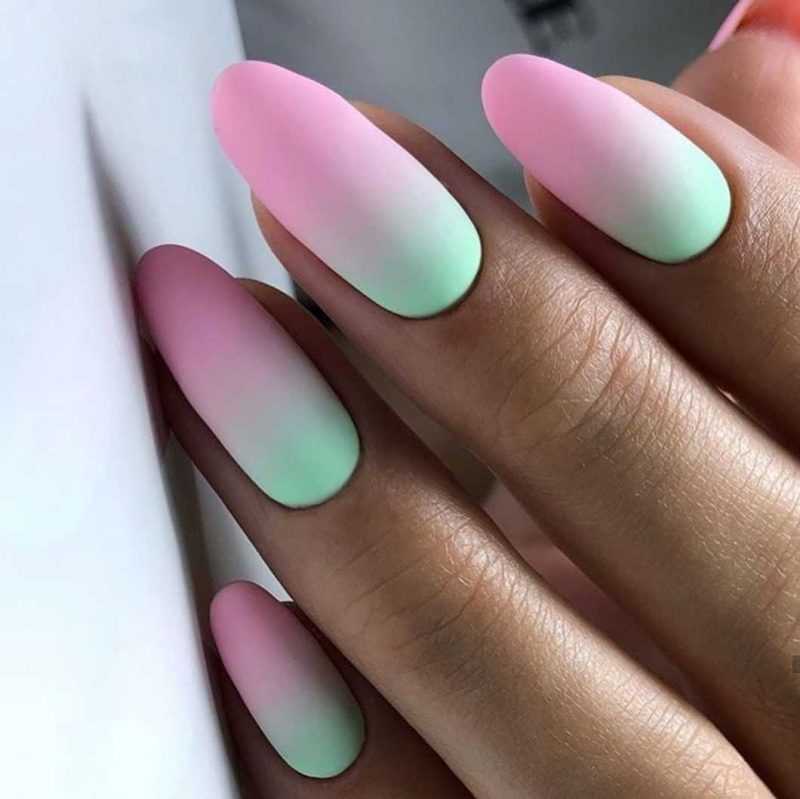 В весенний и летний сезон актуальными будут пестрые тона свежей зелени и расцветающих розовых цветков. А матовые же цвета будут весьма оптимальным решением в зимнее время. Оригинальным решением станет мятно-розовый градиентное омбре.