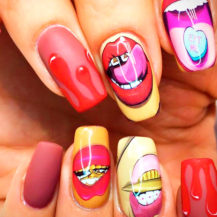 Дерзкий сексуальный маникюр, где губы эротически облизывает розовый язык.