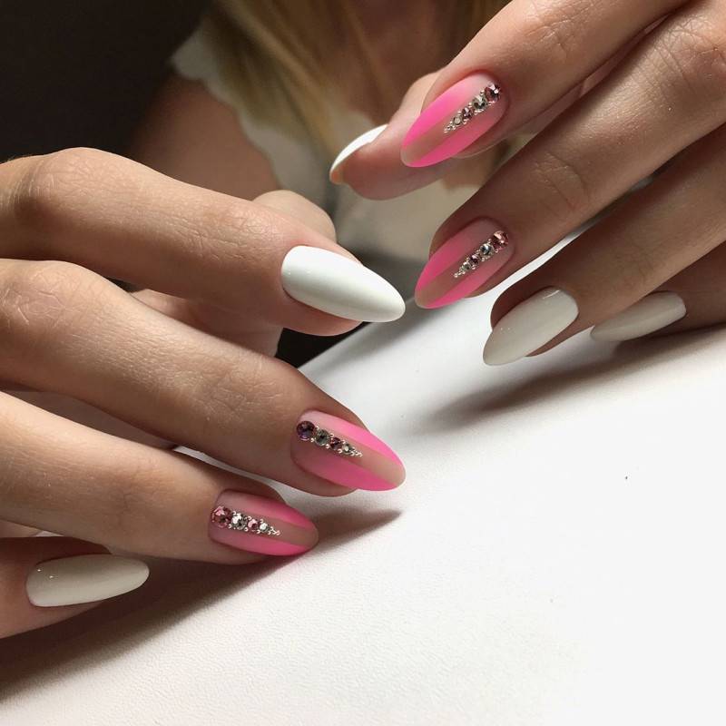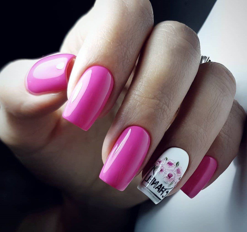 Одно из самых гармоничных и утончённых сочетаний – розовый с белым. С последним цветом можно сочетать как яркие оттенки, так и приглушённые. В дополнении с цветочной росписью каждый из представленных вариантов маникюра смотрится изысканно и романтично.