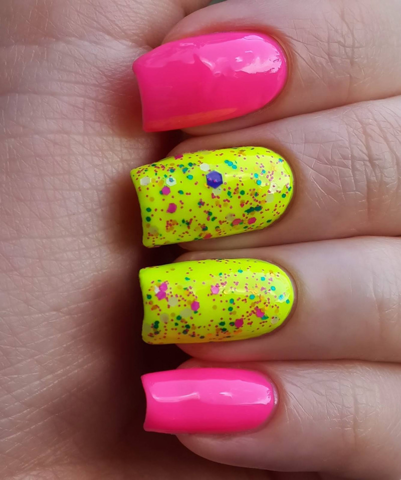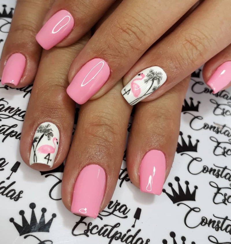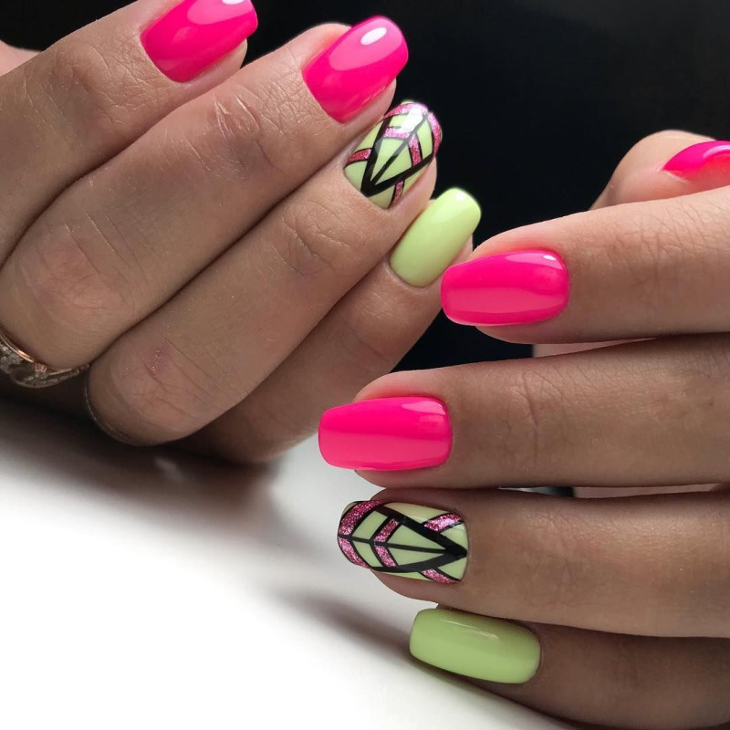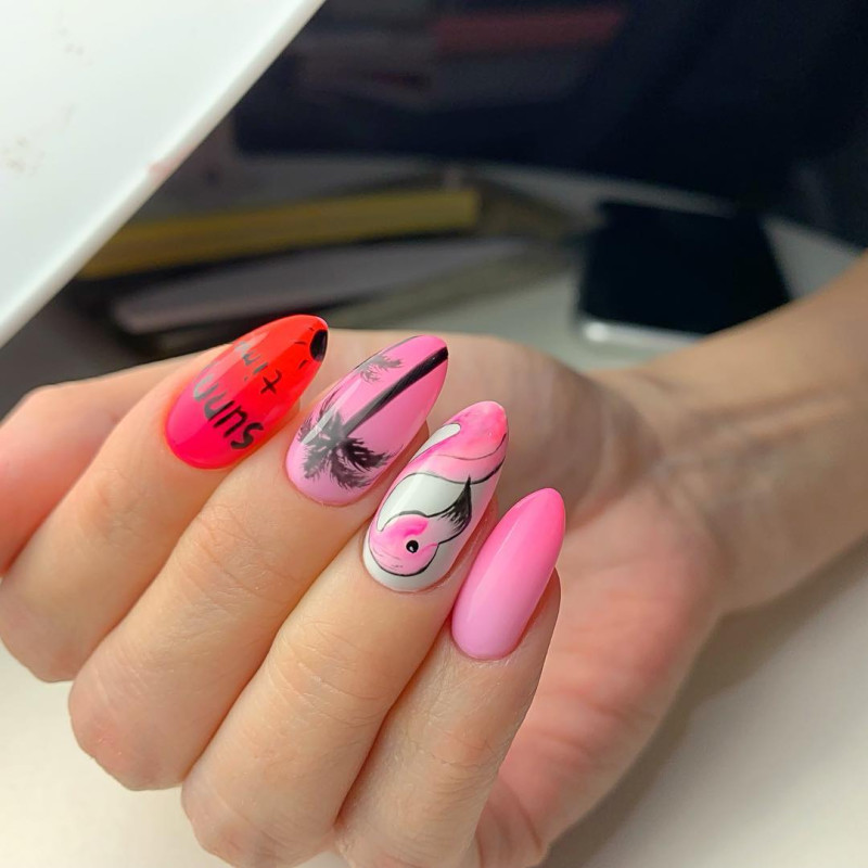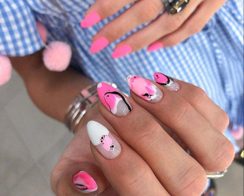 Чтобы сделать более яркий, насыщенный нейл-арта, стоит выбирать соответствующие оттенки лака. Это может быть классический розовый цвет или фуксия. Их комбинируют преимущественно с черным, фиолетовым и синим цветом. Хорошей альтернативой будет желтый, серый, голубой и другие оттенки. Также стоит отметить, что он отлично смотрится с золотистым или серебристым покрытием. Такое сочетание получается более ярким, праздничным.