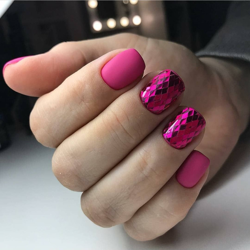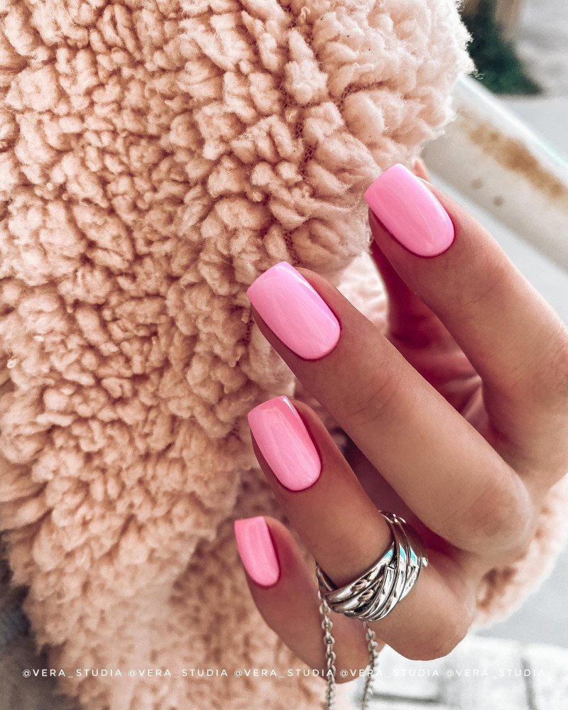 Действительно, оригинальный розовый способен создать яркий акцент в любом образе. Он прекрасно сочетается как с базовыми, так и с яркими цветами, что мы докажем в подборке идей маникюра в розовых тонах.