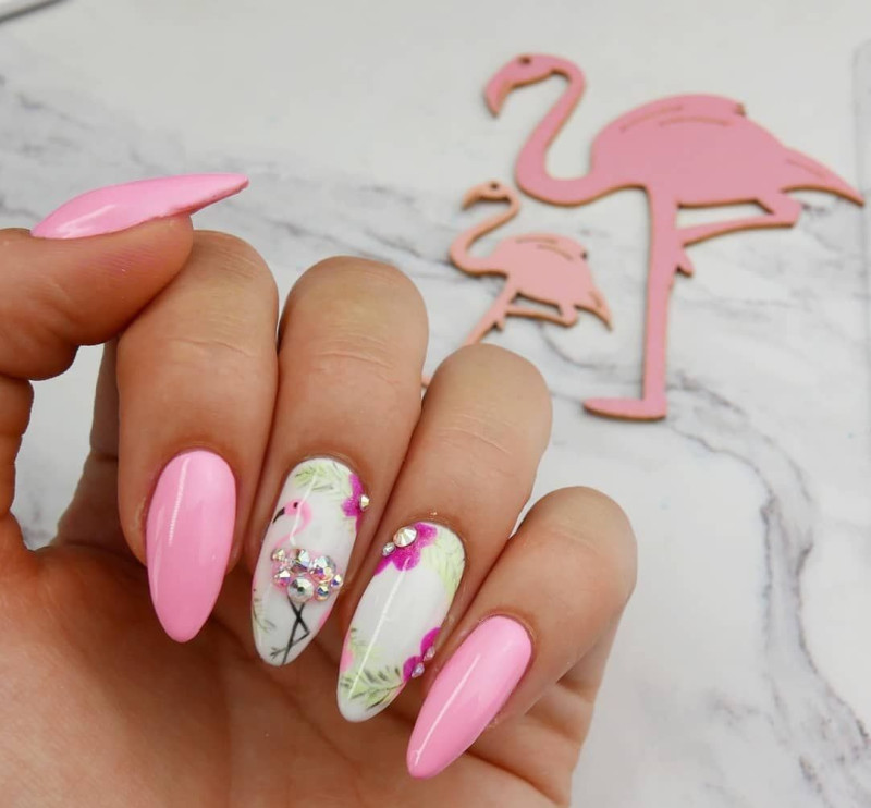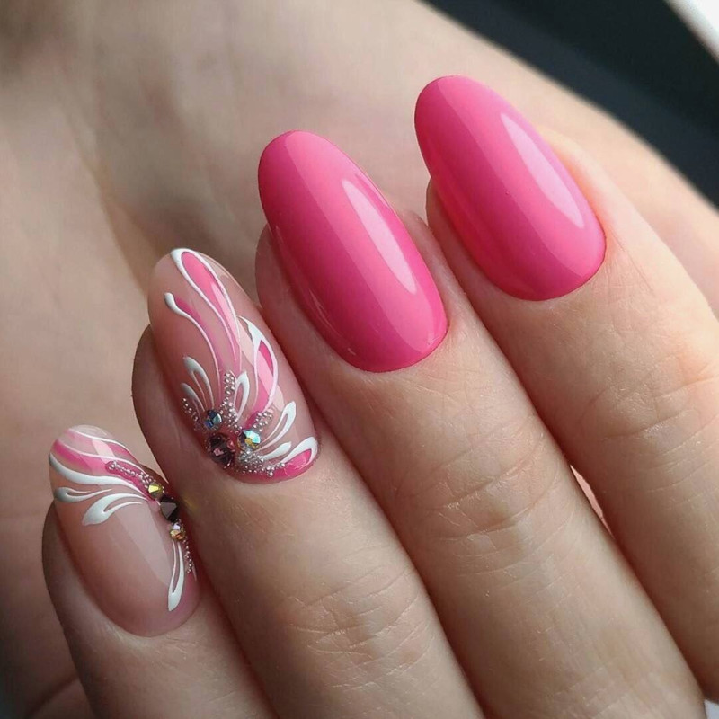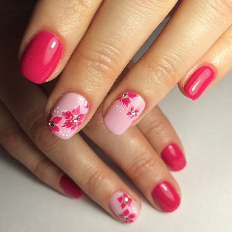 Тем, кто любит обратить на себя внимание и блистать в самом эпицентре праздника, могут понравиться варианты ярко-розового цветочного маникюра, дополненным стразами или блестящим акриловым напылением