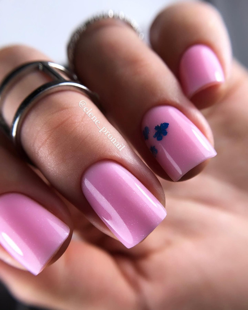 На розовых ногтях можно изображать любые цветы. В весеннее время большой популярностью пользуются милые бутончики на светлом пастельном тоне. Такой маникюр можно носить повседневно – он достаточно сдержан, но и не лишен изюминки благодаря контрастирующему сочетанию кремово-розового нюдового оттенка и синего с черным.