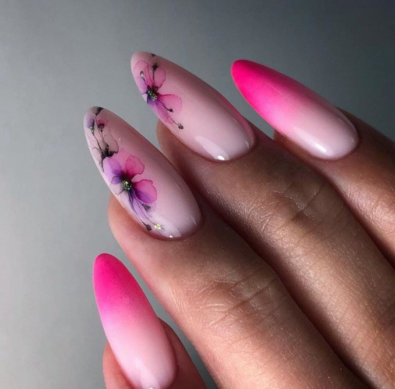 Очень красиво выглядит цветочный принт в сочетании с классическим френчем, матовым покрытием, объёмной росписью.