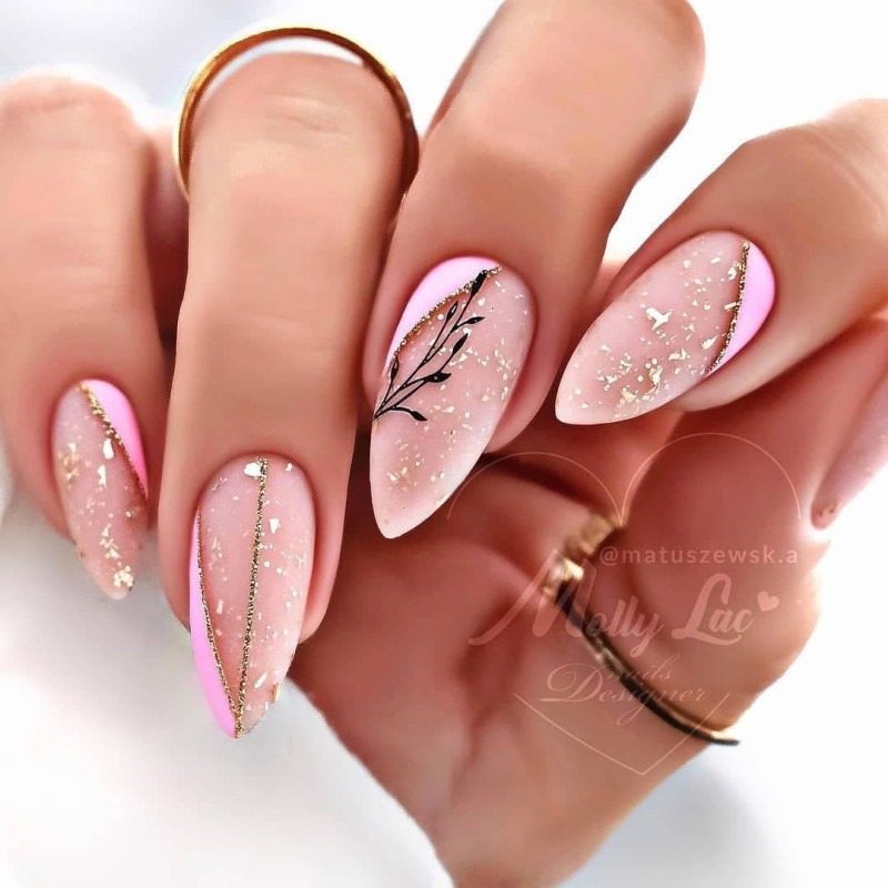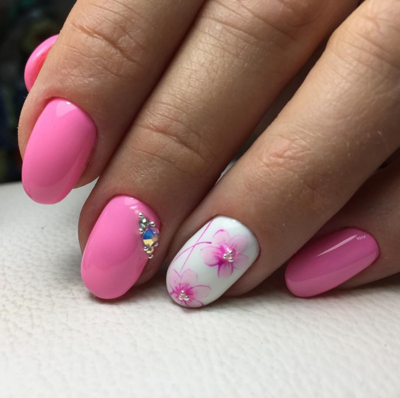 Розовый маникюр с флористическим дизайном может идеально смотреться даже на коротких ногтях или при средней длине пластин:
