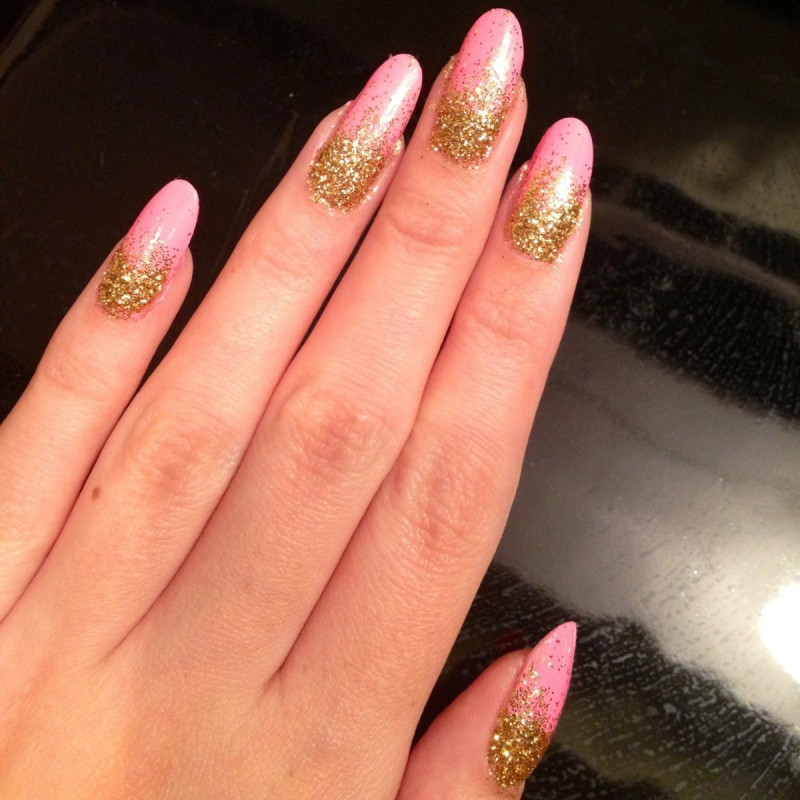 Очень современно и оригинально будет выглядеть блестящий французский маникюр на длинных острых ноготках или на ноготках формы балерина.