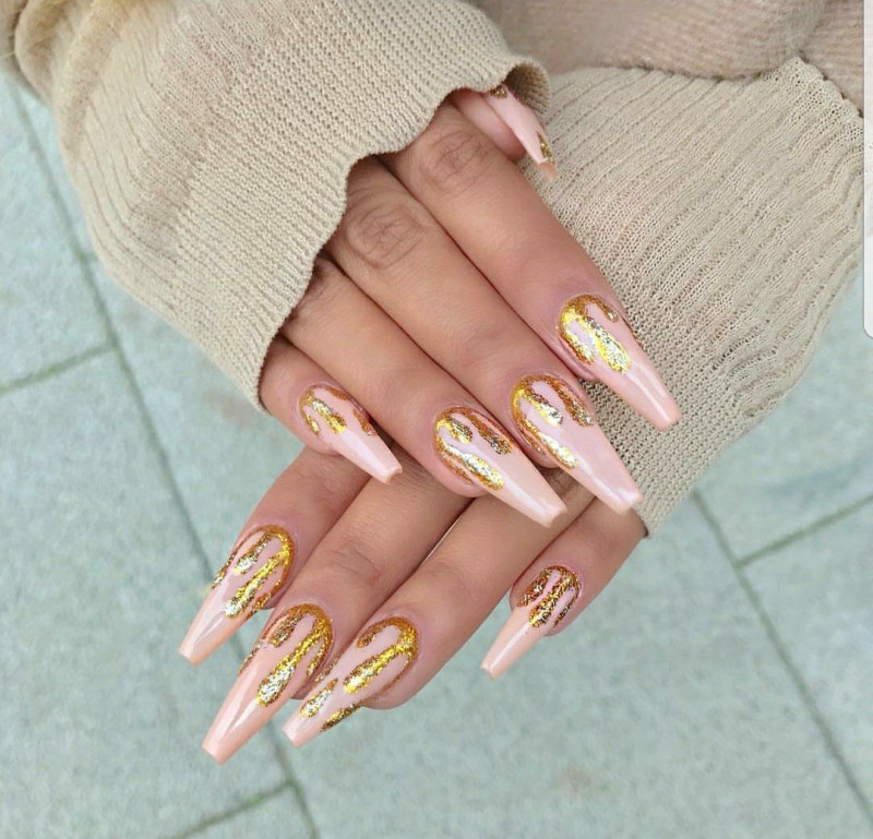 Для любительниц смелого и яркого нейл-дизайна можно в палитру добавить золотые полоски. Понятно, что подобный вариант восхитителен на длинных ногтях.