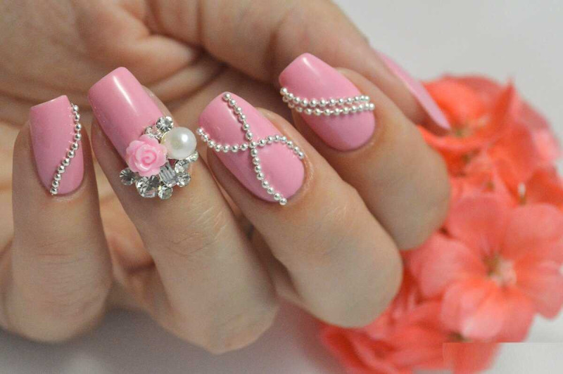 Для особенных событий подойдёт сочетание розового цветочного маникюра с элементами декора: