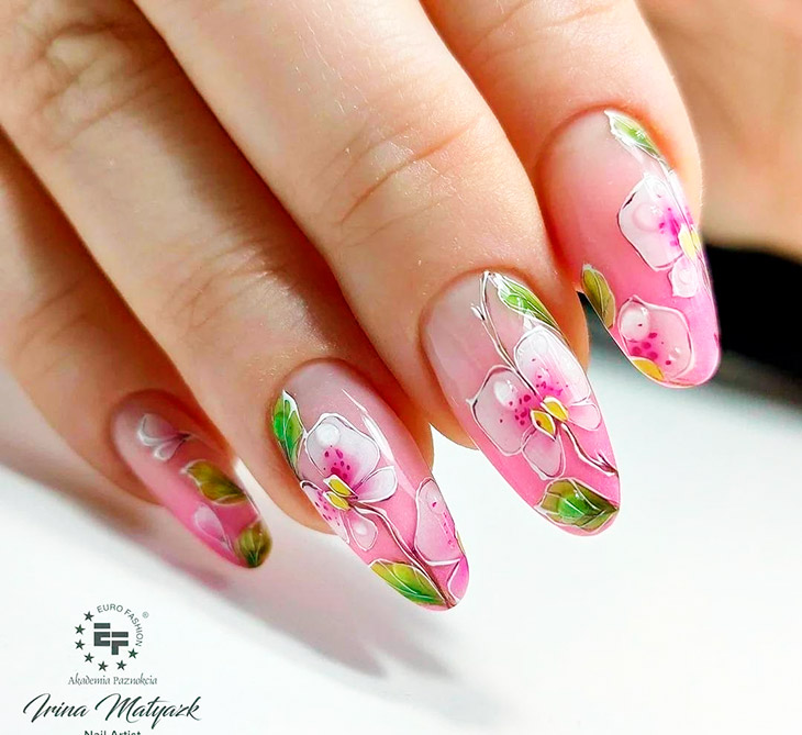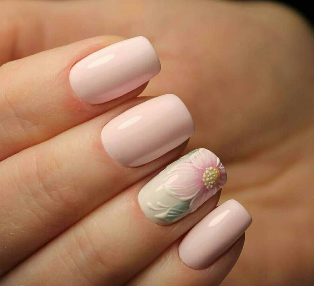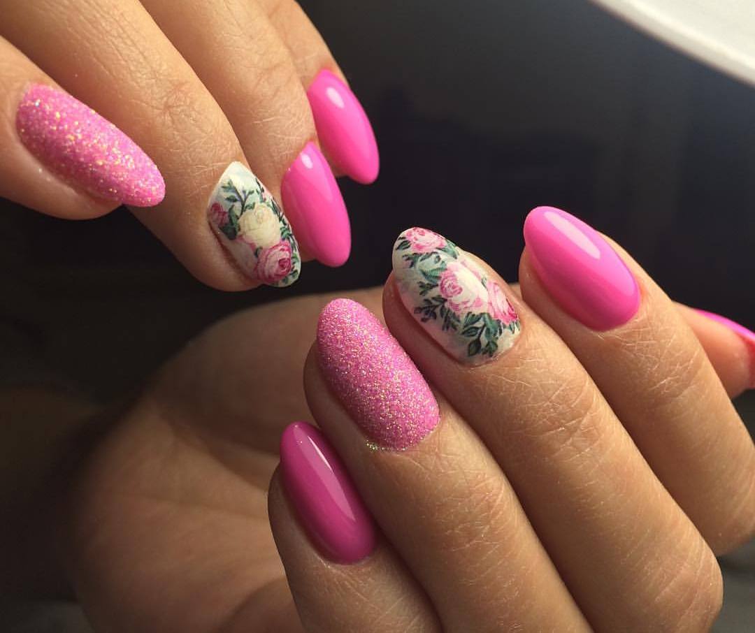 Розовый маникюр с флористическим дизайном может идеально смотреться даже на коротких ногтях или при средней длине пластин:
