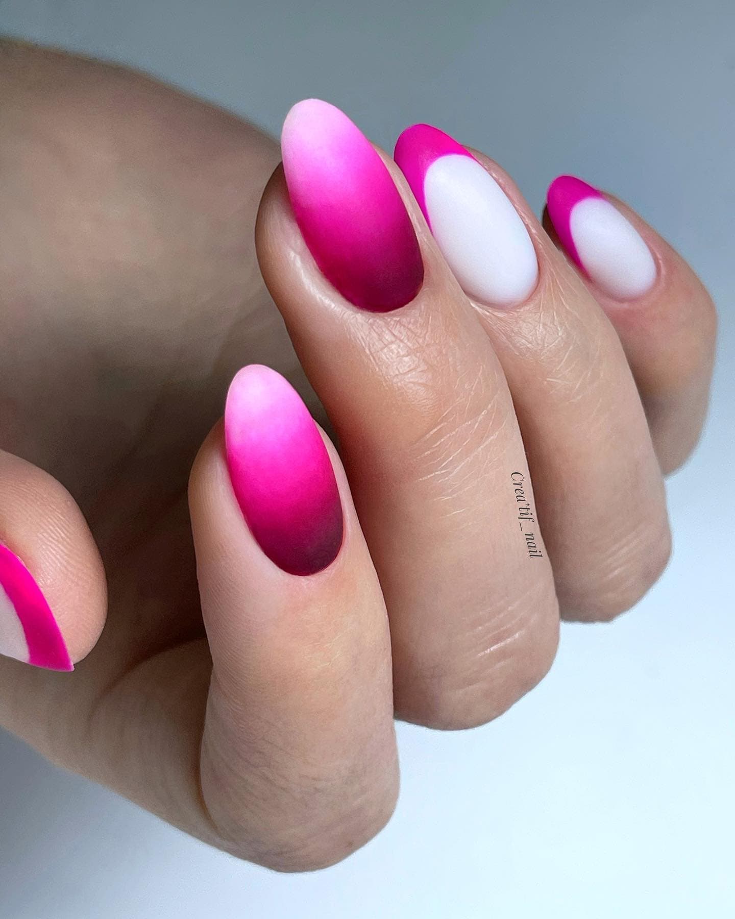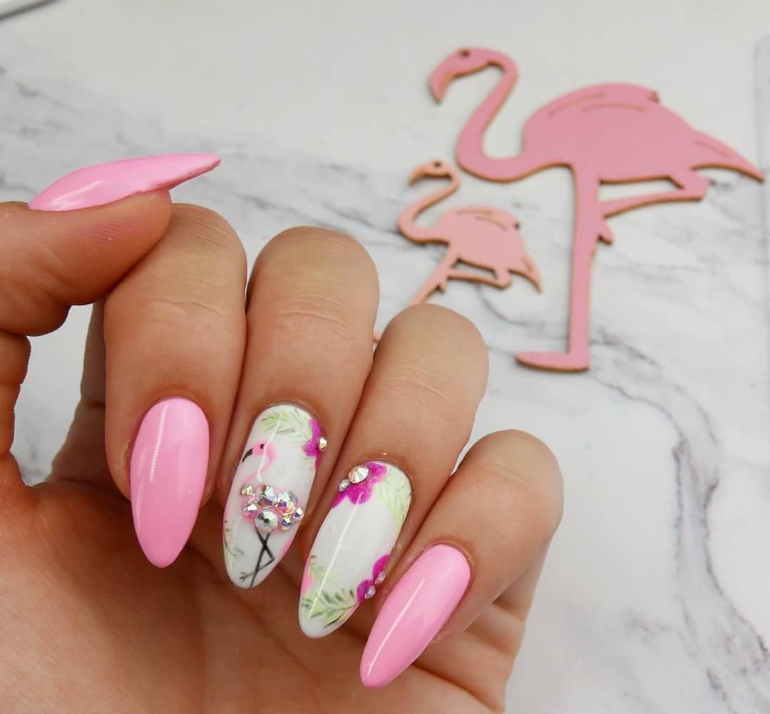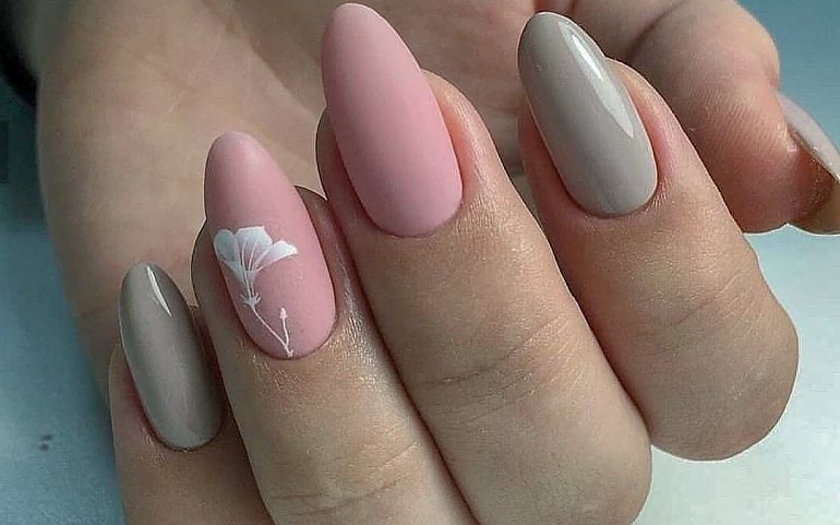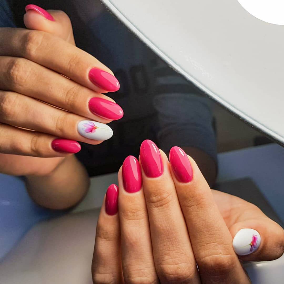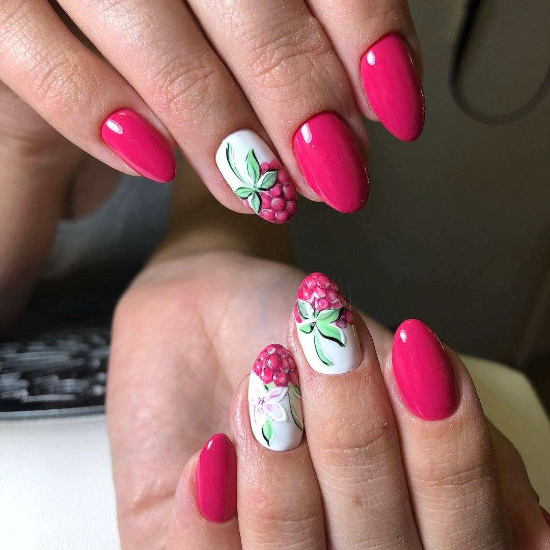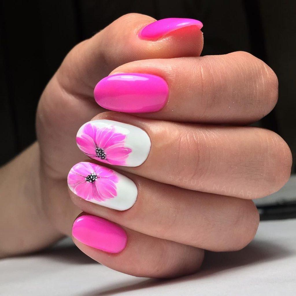 Одно из самых гармоничных и утончённых сочетаний – розовый с белым. С последним цветом можно сочетать как яркие оттенки, так и приглушённые. В дополнении с цветочной росписью каждый из представленных вариантов маникюра смотрится изысканно и романтично.