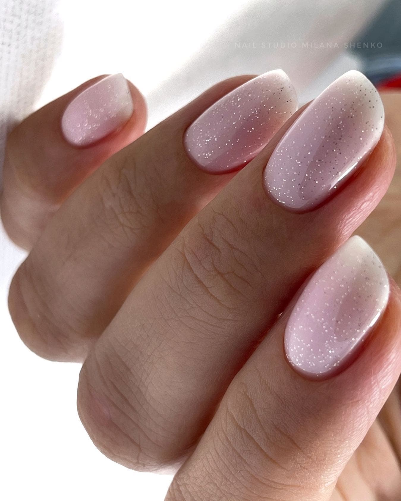 Очень стильно смотрится френч с блестками на коротких ноготках, в любых цветовых решениях.