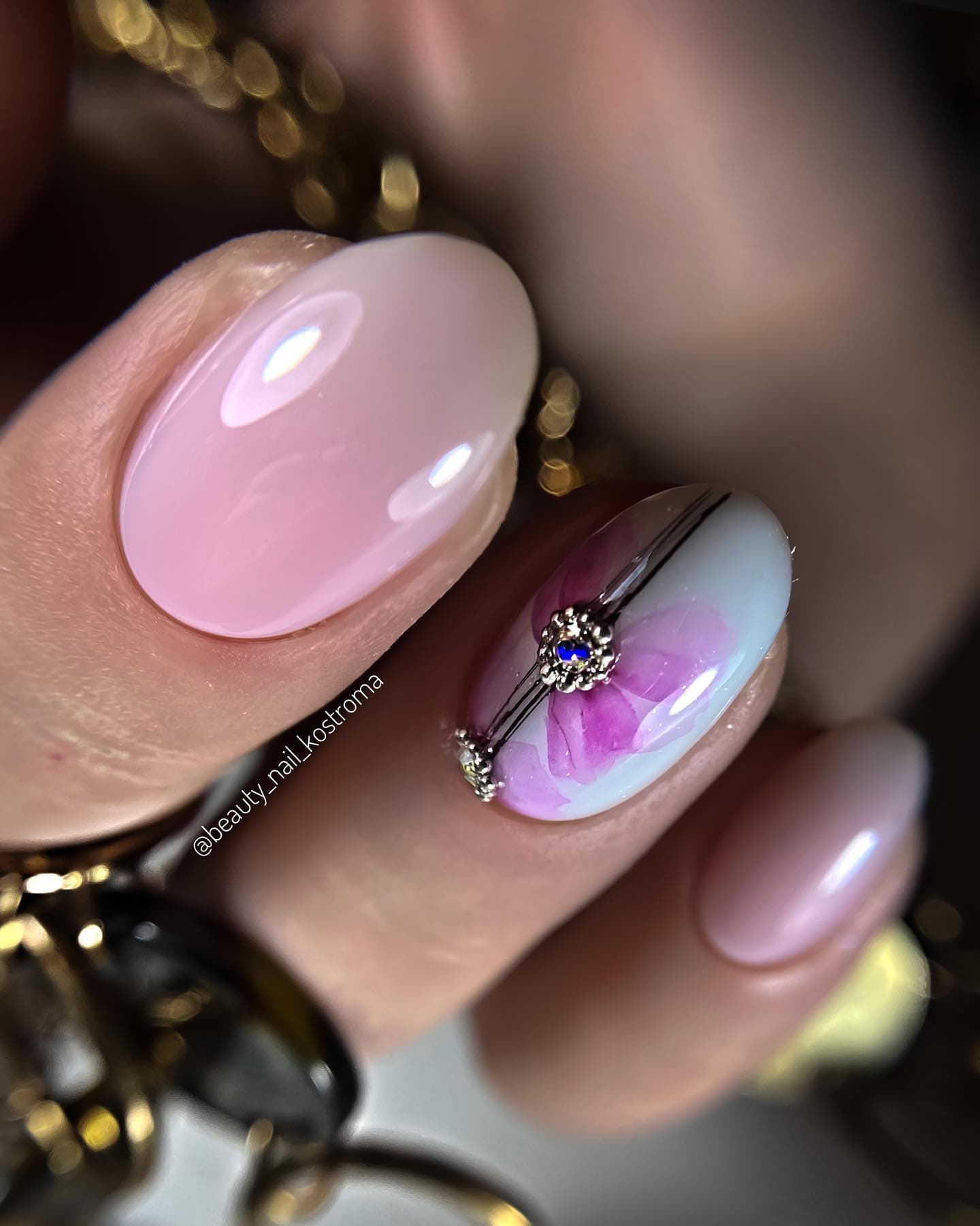 Для особенных событий подойдёт сочетание розового цветочного маникюра с элементами декора:
