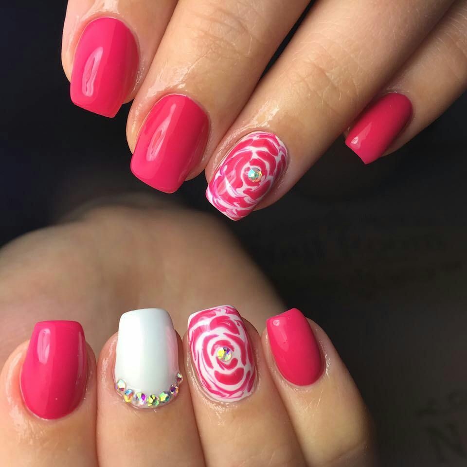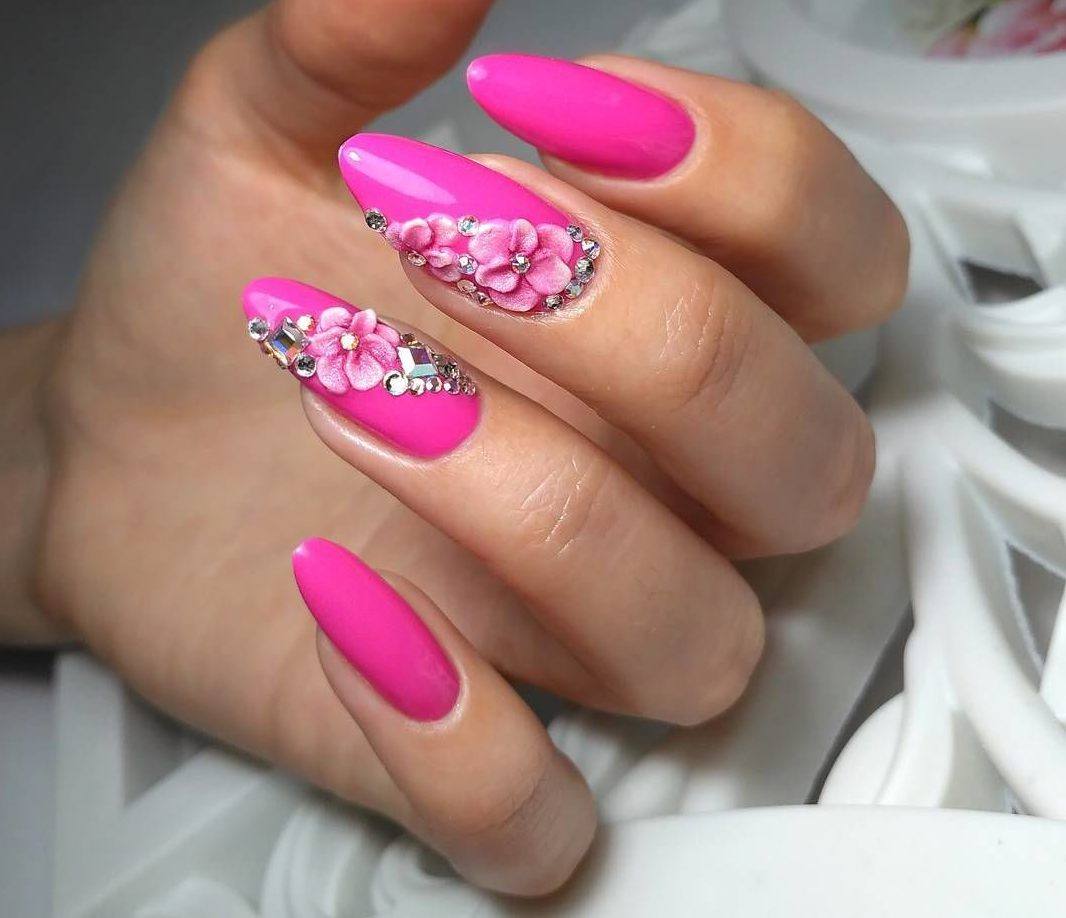 Тем, кто любит обратить на себя внимание и блистать в самом эпицентре праздника, могут понравиться варианты ярко-розового цветочного маникюра, дополненным стразами или блестящим акриловым напылением