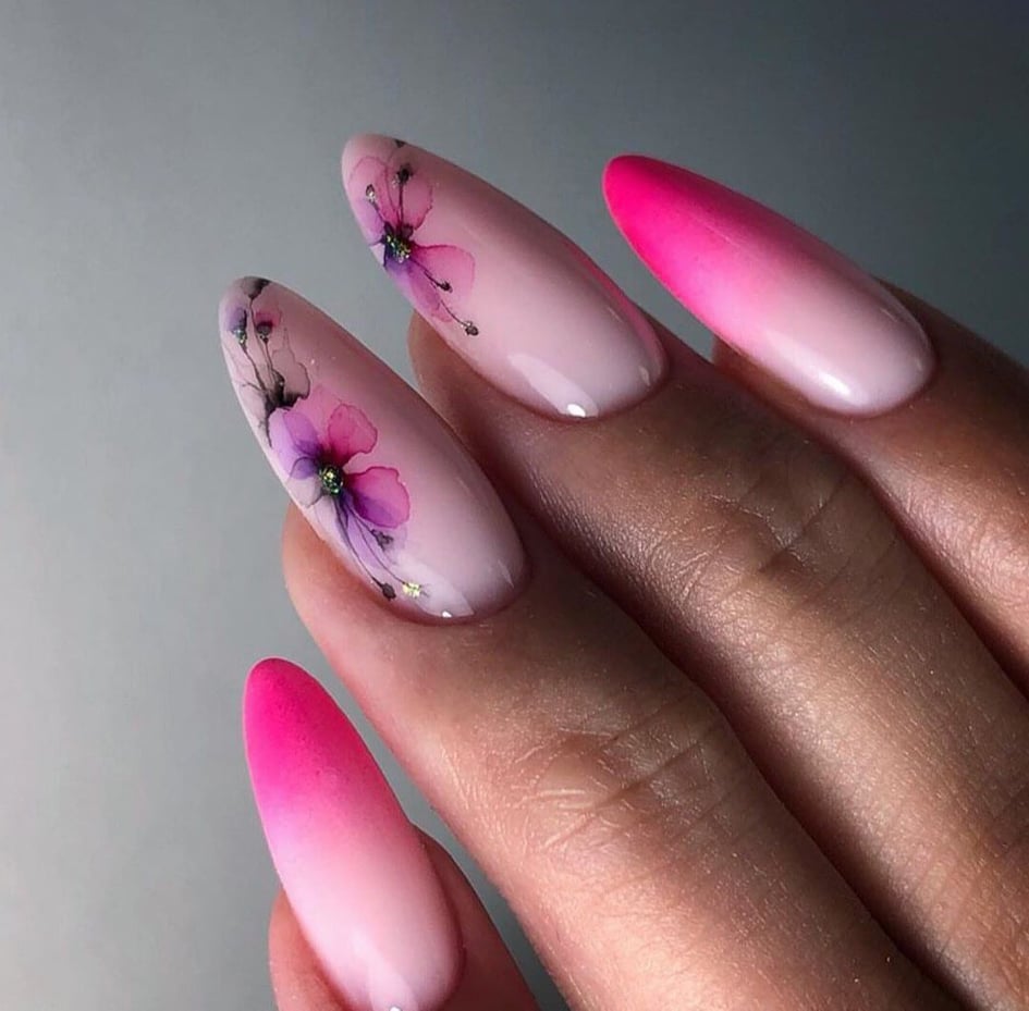 Очень красиво выглядит цветочный принт в сочетании с классическим френчем, матовым покрытием, объёмной росписью.