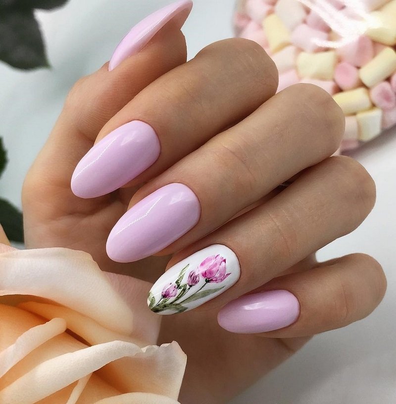 Очень изысканно смотрится абстрактная роспись белого цвета на пудрово-розовом основном тоне. В качестве яркого акцента выступает декор на безымянном пальце: нежные тюльпаны светло-фиолетовых оттенков на белоснежном фоне, очень освежают нейл-арт зеленые листья и жёлтые вкрапления цветов – прекрасный вариант для весеннего маникюра!