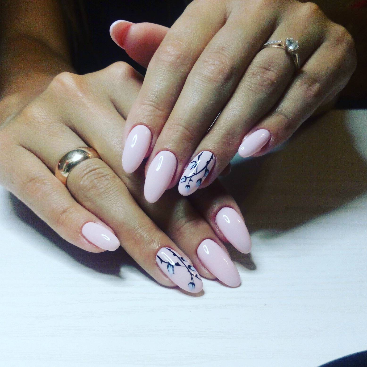 На розовых ногтях можно изображать любые цветы. В весеннее время большой популярностью пользуются милые бутончики на светлом пастельном тоне. Такой маникюр можно носить повседневно – он достаточно сдержан, но и не лишен изюминки благодаря контрастирующему сочетанию кремово-розового нюдового оттенка и синего с черным.
