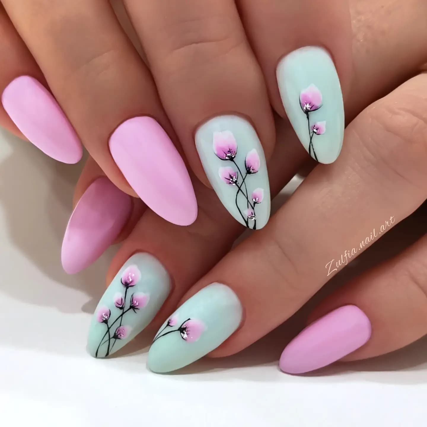 Необычен и следующий маникюр, выполненный в модном сочетании мятного оттенка с нежно-розовым. Этот дизайн оценят утончённые и романтические натуры. Роспись в виде весенних цветов органично сочетается со светлыми стразами и бульонками у основания ногтей.