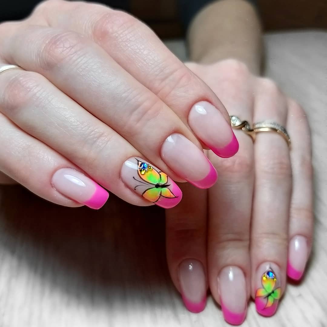 - Обязательно сделайте нежнейший оранжевый френч с красивым декором в виде бабочки!