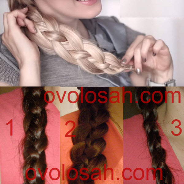 Фото под номером 1 — это заплетенная коса из 4 прядей, 2- это с растянутыми крайними прядями, 3 — это обратная сторона плетения.