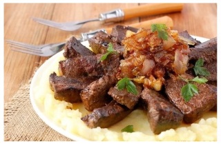 - Бефстроганов из вареного мяса, отварные язык и печень.