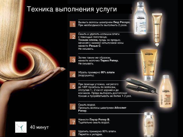В набор от Лореаль входит: очищающий шампунь «Пюр Ресорс», теромозащитное молочко «Термо Репер», средство для глянцевания » Глубокий уход Ренью С» оно должно быть в ампулах, шампунь «Абсолют Репер» и фиксирующий результат состав «Пауэр Репер В» так же выпускается в ампулах. Цена на такой набор имеет достаточно немалую величину, но она все таки ниже чем цена сеанса в парикмахерском салоне.