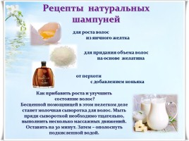 - протеины. Рецепты натуральных шампуней можно обогатить протеиновыми добавками, которые важны для восстановления повреждённых участков волос, разглаживания их чешуек и внутренней структуры. Протеин овса богат аминокислотами, витаминами группы В, А, К, Е. Овёс – настоящий рекордсмен по содержанию цинка и кремниевой кислоты. Эти вещества крайне важны для формирования структуры белков. Протеины пшеницы питают волосяные стержни, способствуя формированию в них кератина и восстановлению повреждённых волос. Протеин шёлка придаёт блеск, защищает от УФ излучения, термовоздействия, облегчает укладку, выравнивает поверхность волос, восстанавливает и питает внутреннюю структуру волос.