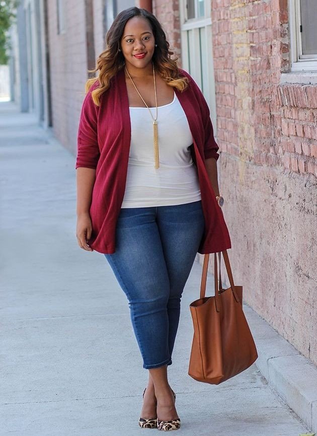 Сочетать их лучше с классическими брюками или клёшеными джинсами. А вот популярных среди пышек комбинаций с лосинами следует однозначно избегать.