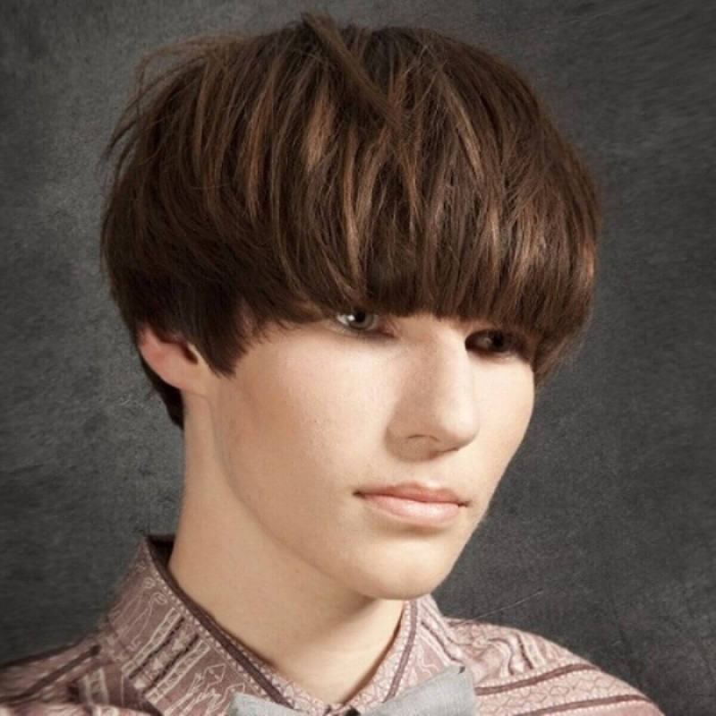 Ровный срез под каре прекрасно комбинируется с чёлочкой до середины носа, которую зачёсывают на бок. Такая стрижка скорректирует широкое лицо и шикарно подойдёт молодым парням.