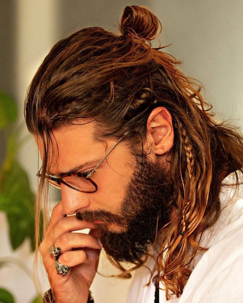 Классический пучок на базе удлиненной мужской стрижки в 2024 будут носить не только молодые художники и неформалы, но и солидные мужчины в возрасте. Такая прическа, с одной стороны, отлично подчеркивает индивидуальный стиль, а с другой – абсолютно не мешает даже во время занятий спортом.