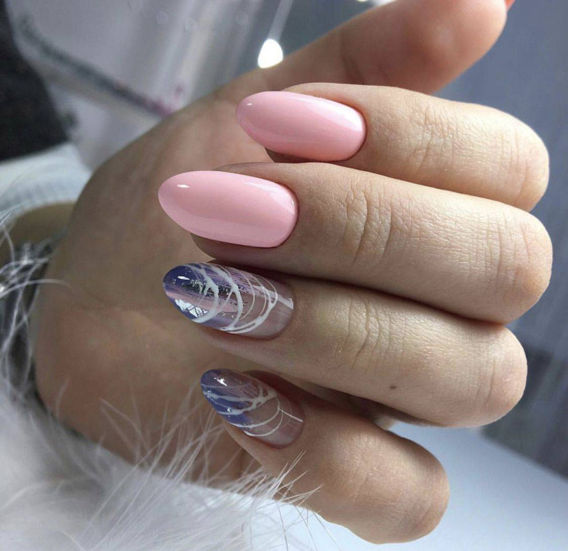 Светлые оттенки, сочетание бежевых, пастельных тонов эффектно смотрятся с яркими стразами, контрастным абстрактным рисунком. Мраморный маникюр можно назвать настоящим хитом оформление миндальных ногтей.