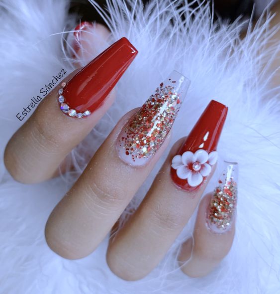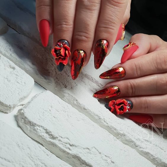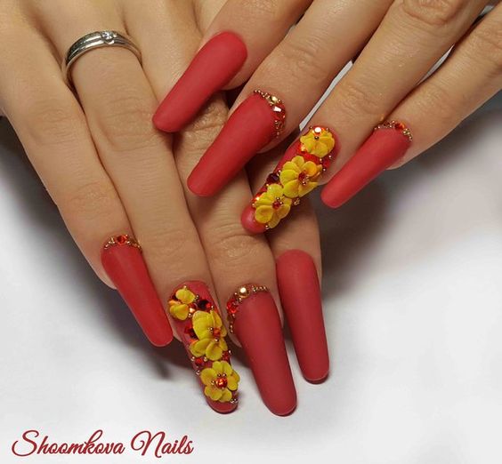 Красный цвет покрытия ногтей подходит ярким личностям, станет отличной основой и добавочным цветом в сочетании с золотой слюдой, бусинами, в технике color blocking.