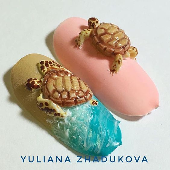 Еще один невероятный по своей красоте маникюр – «живой» аквариумный дизайн. С техникой запечатывания декора между слоями геля знакомы многие. И все, кто уже когда-то испытал ее на своих ноготках, оставались довольны. Ведь это один их самых практичных вариантов нейл-арта для нарощенных ногтей, так как при отрастании разница между цветом искусственного и натурального ногтя не слишком заметна. И если классический вариант аквариумного дизайна вполне можно сделать в домашних условиях своими руками, разумеется, при наличии соответствующих инструментов, то вот «живой» нейл-арт лучше выполнять в салоне у хорошего профессионала, так как делать этот необычный маникюр в домашних условиях непросто. Но попробовать все-таки стоит.
