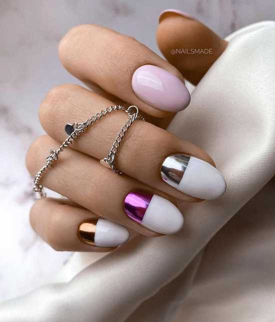 - Лучше всего фольга сочетается с однотонными ногтями красного, белого, синего, фиолетового и зеленого цветов. Также можете использовать черный матовый тон .