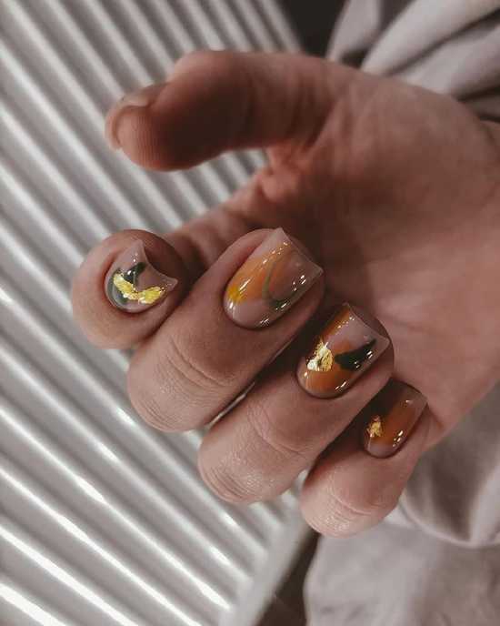 Светлые оттенки, сочетание бежевых, пастельных тонов эффектно смотрятся с яркими стразами, контрастным абстрактным рисунком. Мраморный маникюр можно назвать настоящим хитом оформление миндальных ногтей.