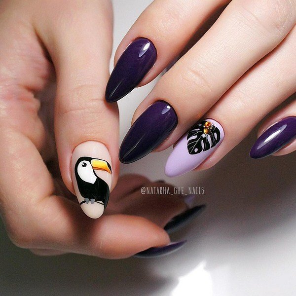 Распространенной темой росписи ноготочков стали изображения животных и птичек, выполненные в красочном и интригующем стиле. Вам непременно приглянутся яркие попугаи, восьминоги, тропические птицы, собачки и много чего еще вы сможете увидеть на ногтях с рисунком 2024-2025.