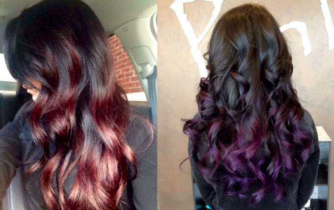 Еще два варианта окрашивания для брюнеток — омбре в ярких красках. В первом случае выбран винный оттенок, во втором — баклажан.