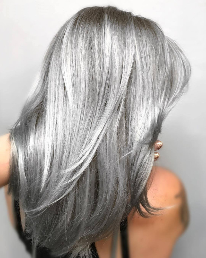 Эффекта «металлик» можно достичь с помощью полуперманентных красок и оттеночных шампуней с серебристым компонентом. Если вы выполняете процедуру дома, то помните, что краску не рекомендуется держать на голове дольше 10 минут, иначе вы рискуете получить не мерцающий модный оттенок, а натуральную седину.