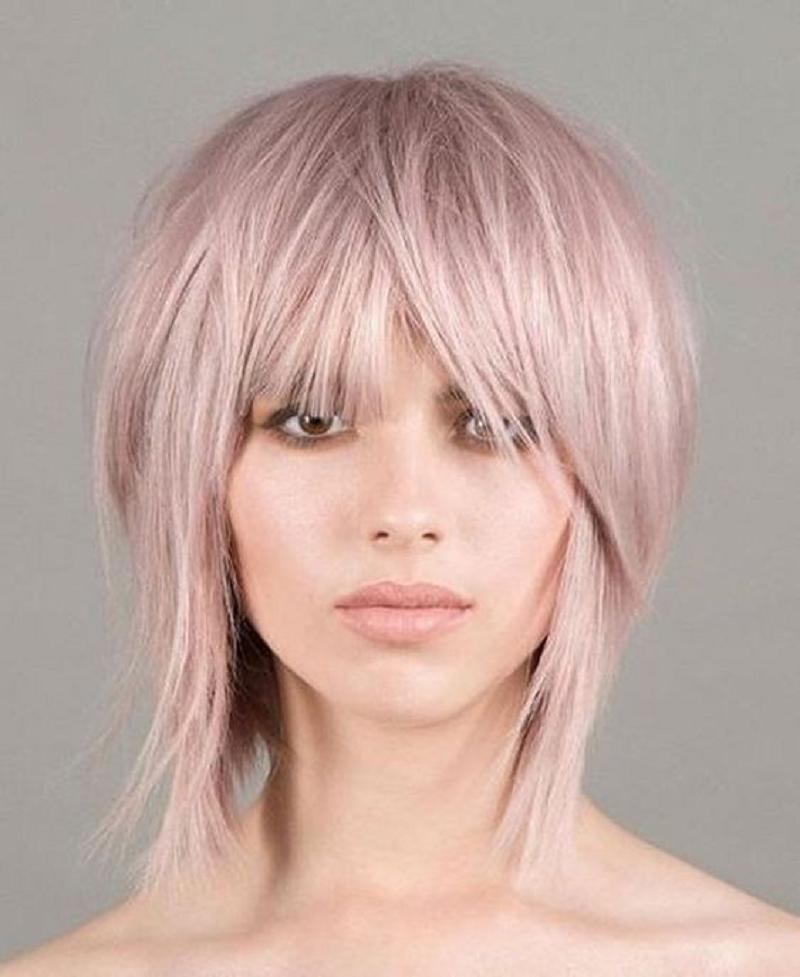 Стилисты придерживаются такого мнения, что женщинам, имеющим округлую форму лица, с средними волосами прекрасно подойдет shag с челкой, двусторонней направленности. Использование этой разновидности стрижки сможет скрыть этот дефект, наделяя обладательницу женственностью и кокетством.