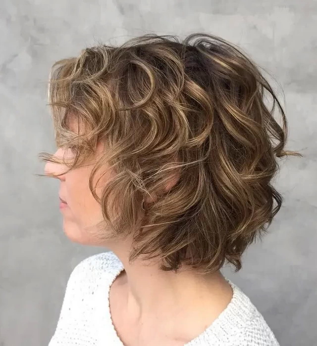 Стрижка шегги для тонких вьющихся волос представлена в коротком варианте, похожем на стрижку лохматый боб.