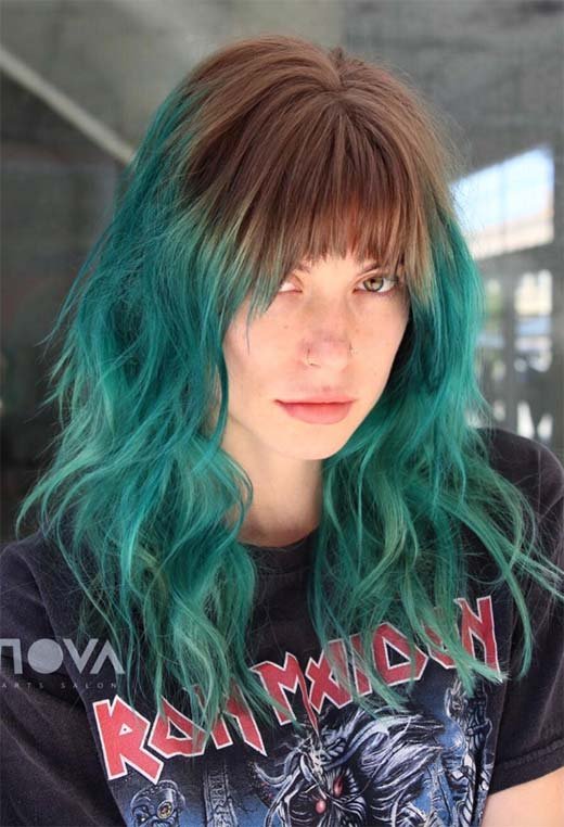 Насыщенный бирюзовый оттенок сочетается с более темными корнями для привлекательного сочетания цветов. Сохраняйте классический стиль шэгги, сочетая более толстые слоистые челки с длинной волос.