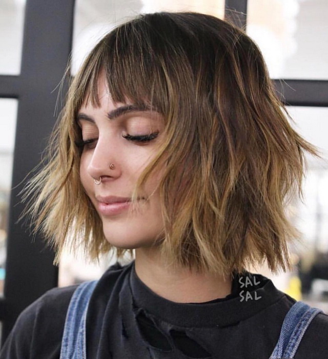 Такую прическу также можно носить с растрепанной челкой. Если вы хотите подчеркнуть волны, попробуйте окрашивание в блондированные блики.