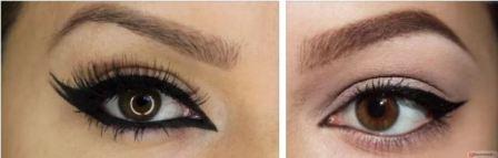 Если нужно сузить глаза, то нужна черная подводка. Распахнуть взгляд можно с помощью светлых серебристых или золотистых оттенков. Глаза взрослых женщин делают открытыми нанесенные густые стрелки, но только не опущенные вниз.