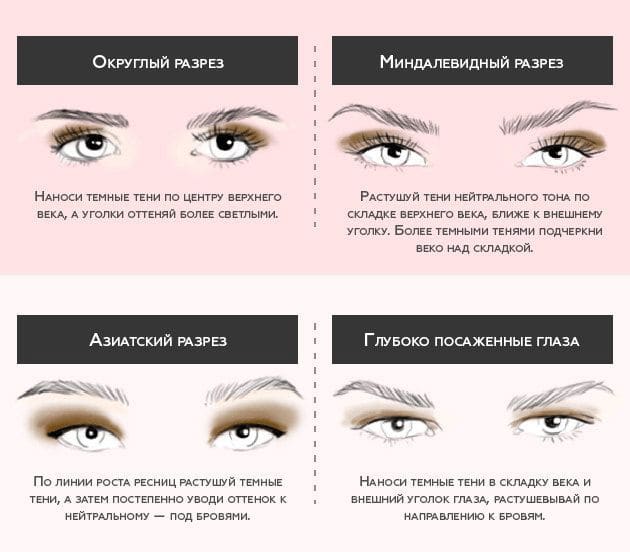 Схемы используются как в вечернем, так и в ежедневном макияже. Как выглядит каждый тип разреза глаз можно посмотреть на картинках ниже.