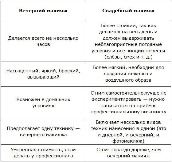 Если вникнуть во все эти нюансы, становится понятным, чем отличается вечерний макияж от свадебного мейк-апа. Ниже представленная таблица наглядно это продемонстрирует.