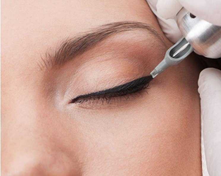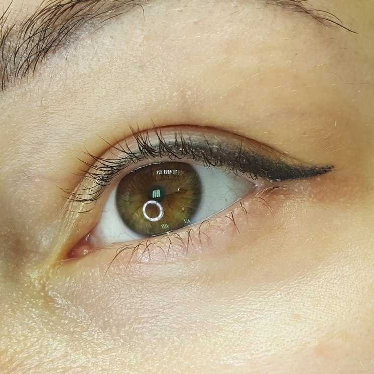 - Провести черную тонкую линию над верхними ресницами, затем растушевать.