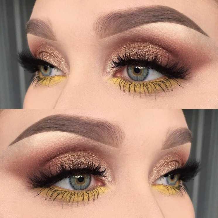 Подбирая оттенки, отталкивайтесь от насыщенности глаз. Если радужка тёмная, нужно наносить насыщенные цвета: сливовый, шоколадный, серый. Если глаза светлые, выбирайте оттенки жёлтого – лимонный или золотой.