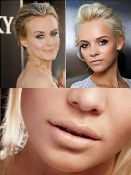 Создавая макияж нюд, нельзя использовать карандаш для губ и помаду с блестками. Более всего подходит обычный блеск для губ, который делает губы естественными. Можно использовать помаду в нежно-розовых, бежевых оттенках. Если отказаться от подводки трудно, то лучше использовать карандаш телесного цвета.