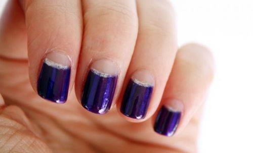 Необычный вариант сочетания синего и белого либо серебристого шеллака – окрашивания верхней части ногтя в темный цвет, а нижней, как бы продлевая кутикулу – в белый или серебристый. Необходимо сказать, что сочетание белого с ультрамариновым, является классикой жанра. В данном случае, любые варианты сочетания будут смотреться интересно и стильно.