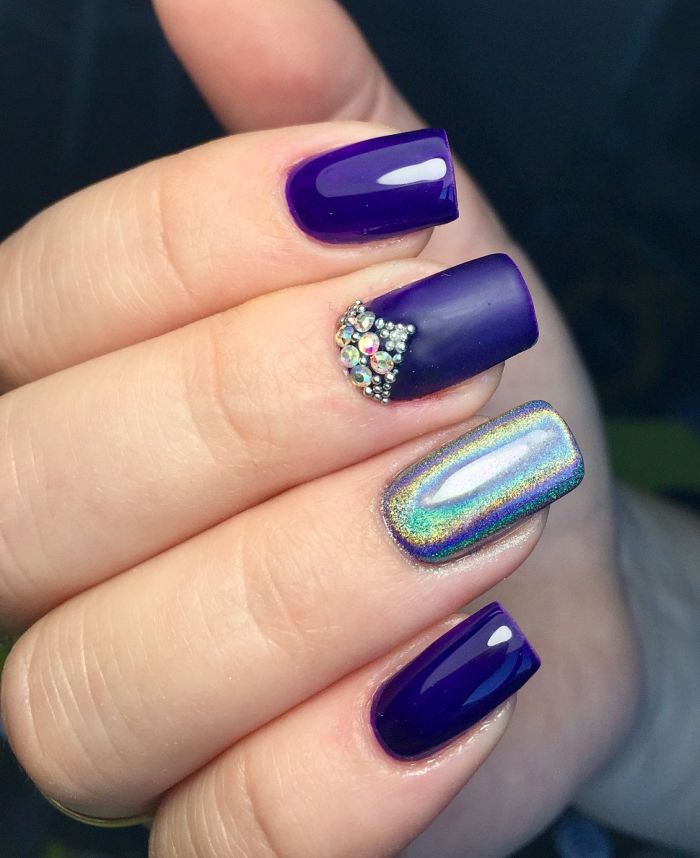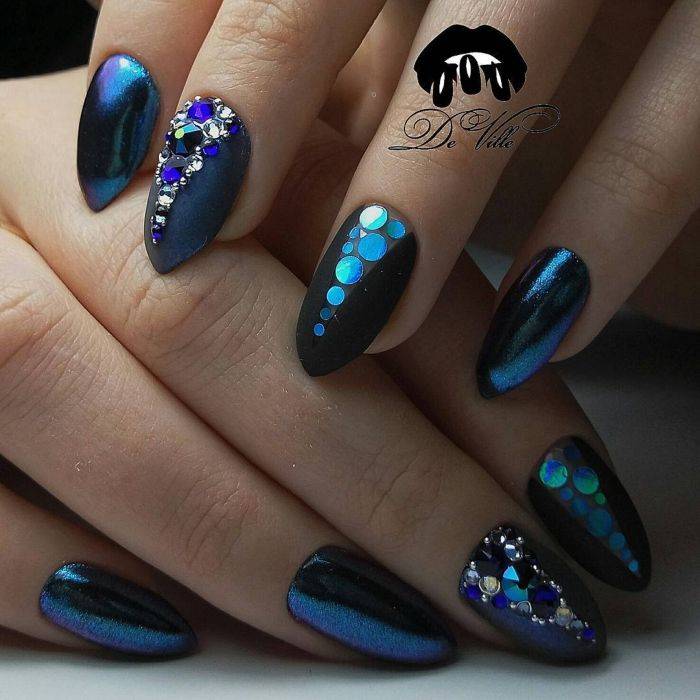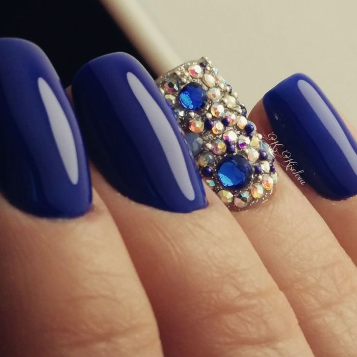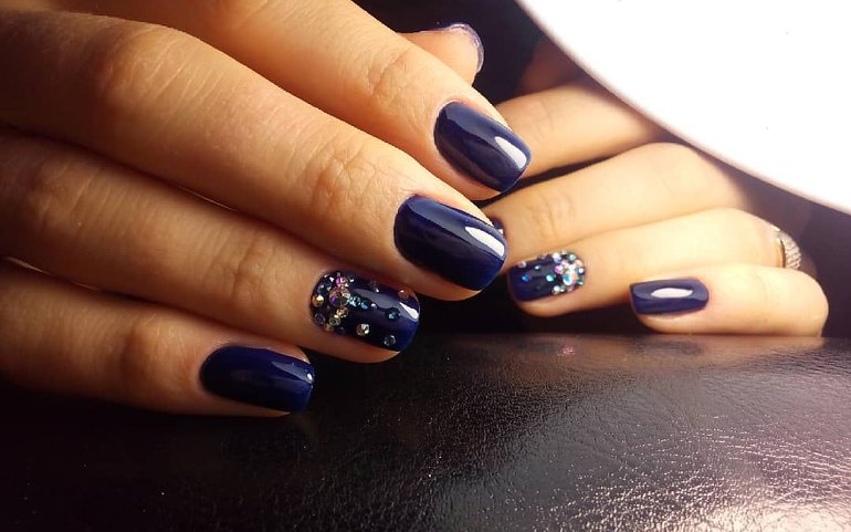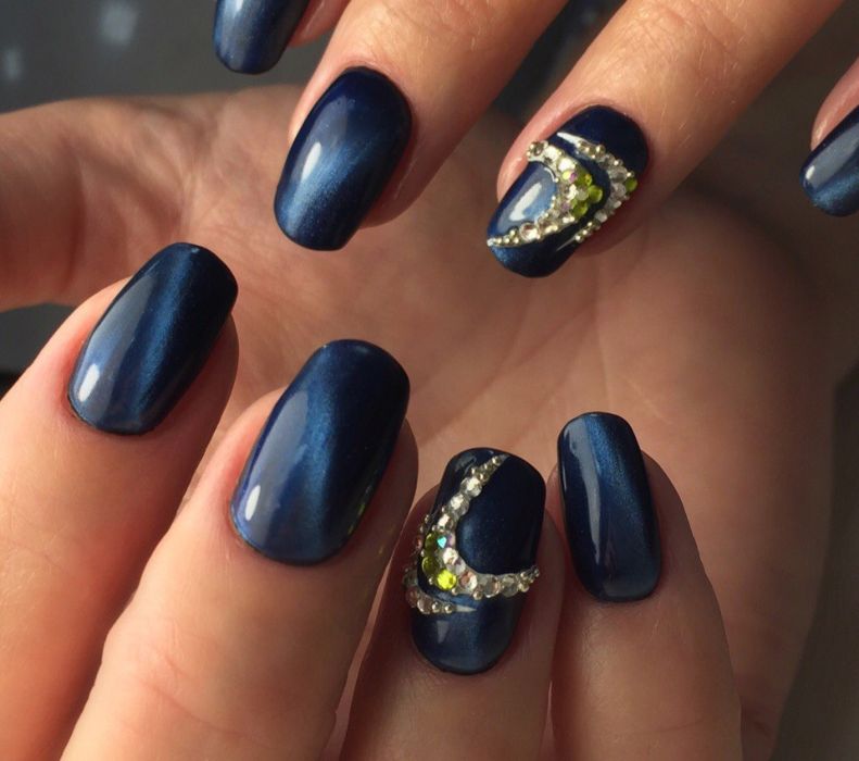 Не менее интересно смотрится однотонный маникюр темно синего цвета, который декорирован стразами либо блестками. Если декоративные дополнения наклеить после нанесения топа, менять узор ногтей можно легко.