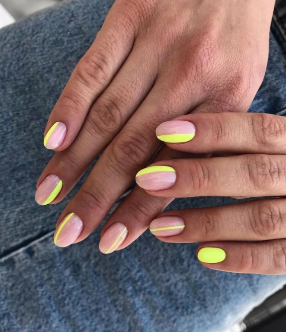 В моде нейл-арт с неоновыми вставками, включениями. Эффектно выглядит маникюр, когда несколько (либо одну) ногтевую пластину покрывают лаком яркого неонового цвета, акцентируют эффектные вставки декорами.